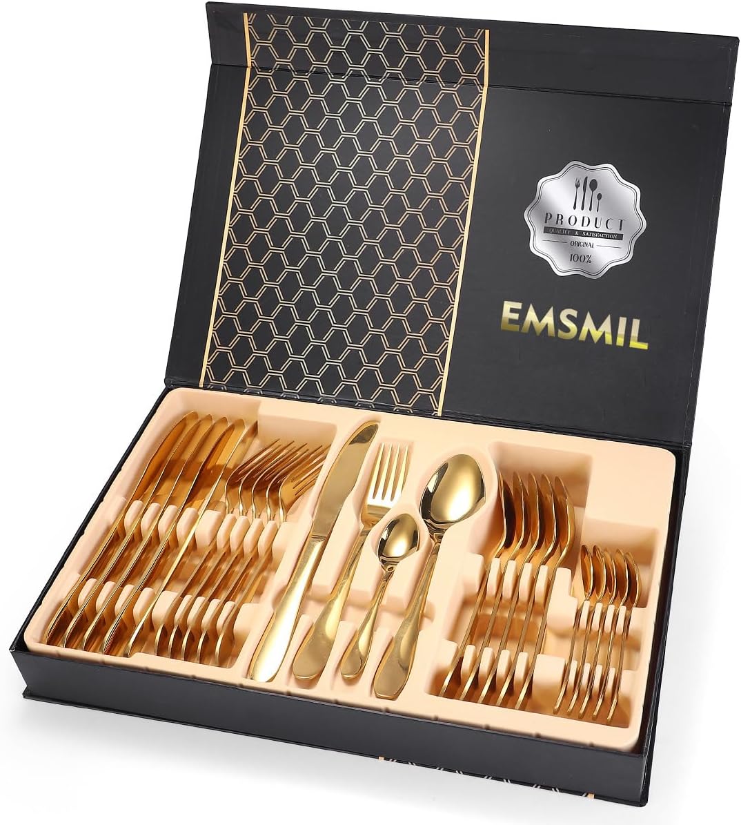 Juego de 24 piezas: 6 tenedores, 6 cuchillos, 6 cucharas de mesa, 6 cucharas de postre. Apto para lavavajillas.